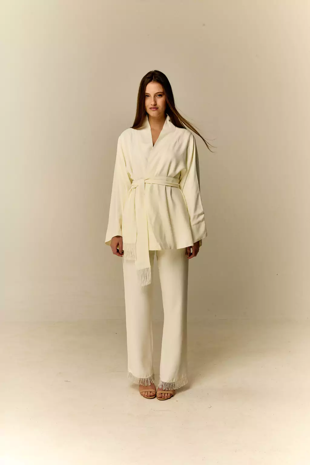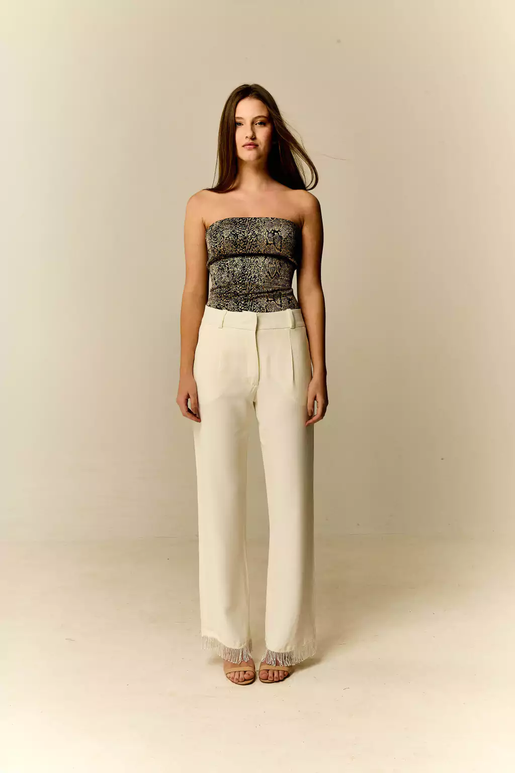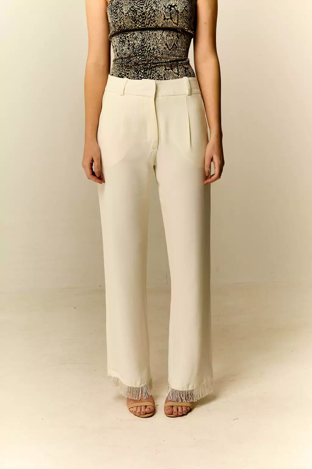 Calça alfaiataria em crepe Patou, com franjas na barra que agregam autenticidade e sofisticação à peça. Apresenta caimento impecável, com transpasse de cinto e pregas frontais que valorizam a silhueta. Detalhes funcionais incluem bolsos frontais e bolso falso nas costas, garantindo elegância e praticidade. Uma escolha diferenciada para compor looks exclusivos.